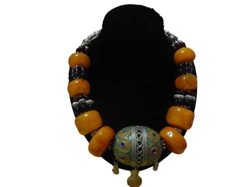 Berber Necklace from Morocco,It is made of eight imitation amber beads and enameled traditional bead in the middle.