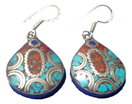 Description Handcrafted earrings from Nepal with Turquoise, Coral imitation stones. It measures around 1.5 inches in height.